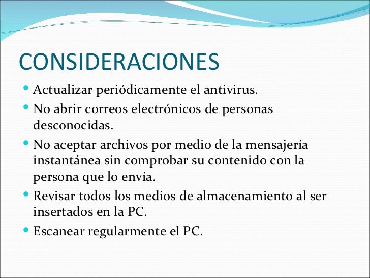 CONSIDERACIONES Actualizar periódicamente el antivirus. No abrir